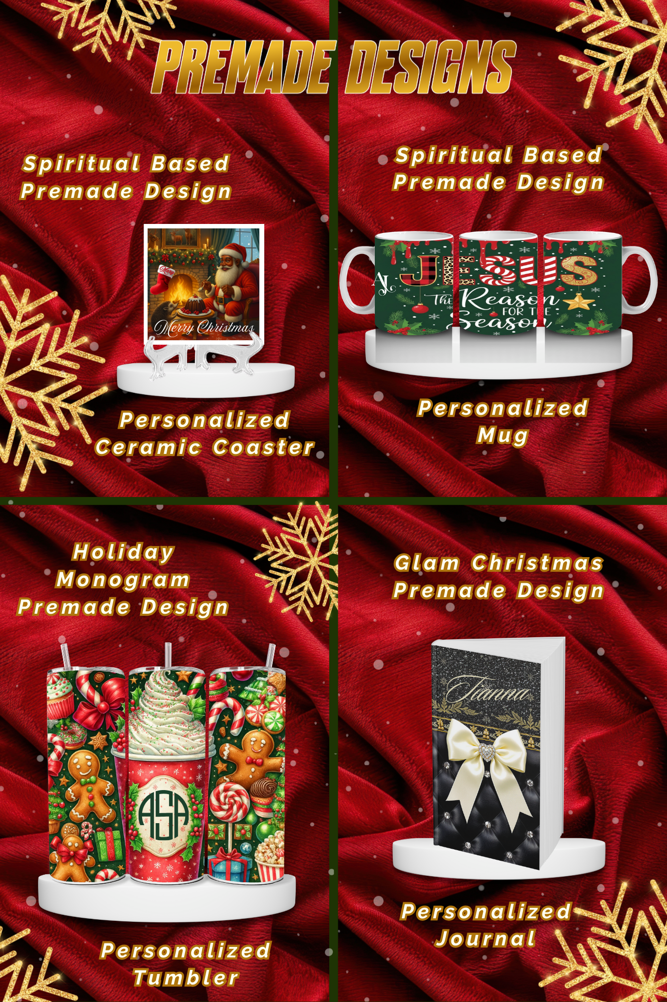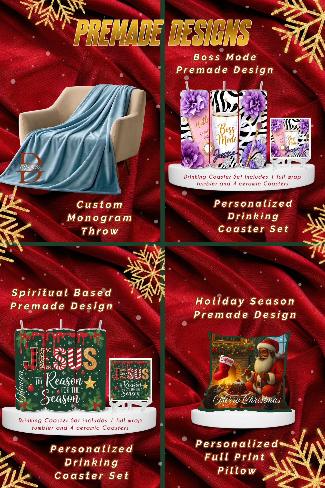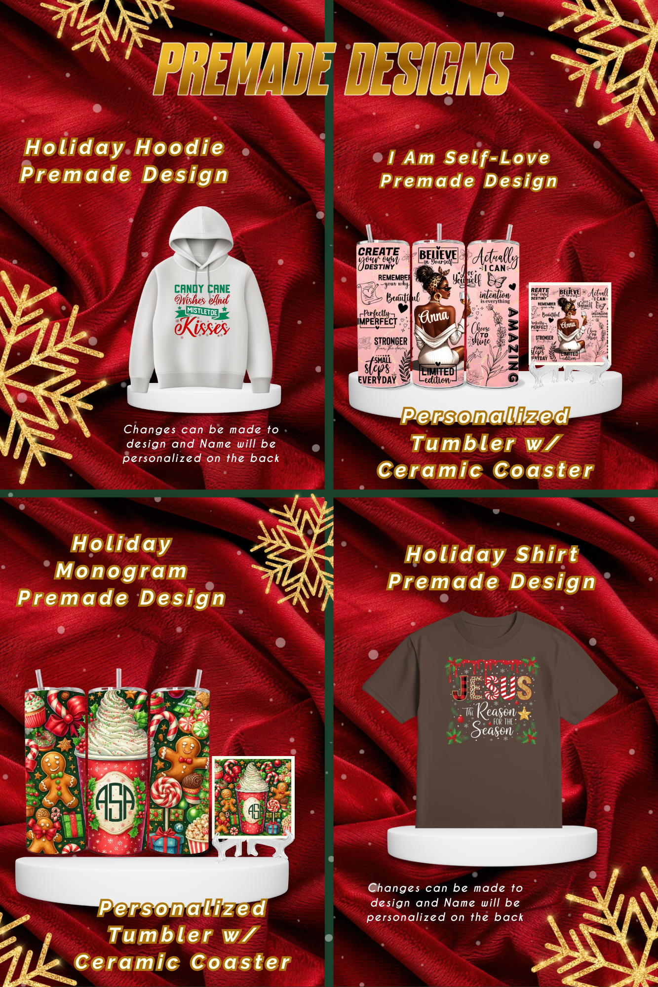 Each item features one of our exclusive pre-made designs with ONE personalized detail (name, initial, or short word).